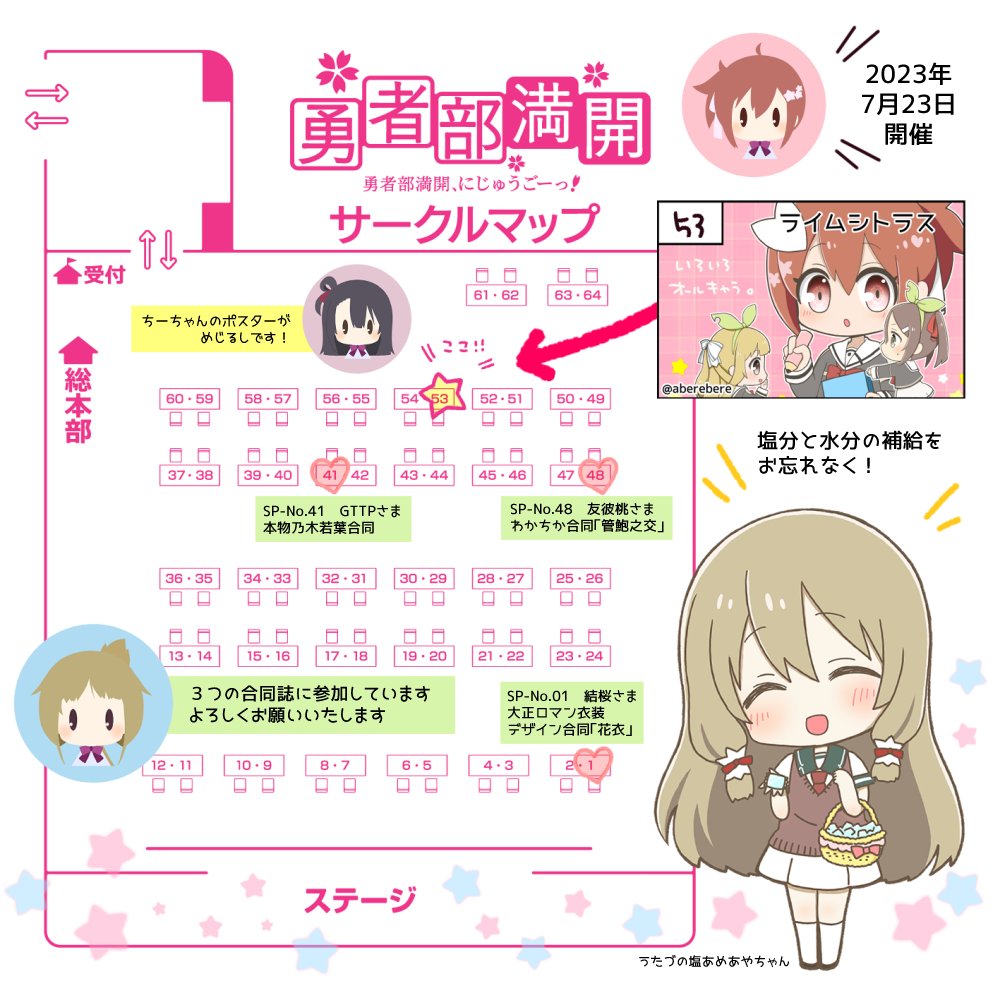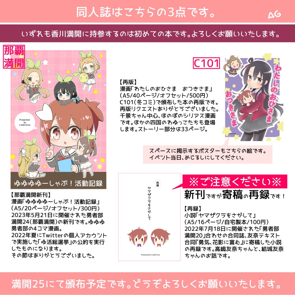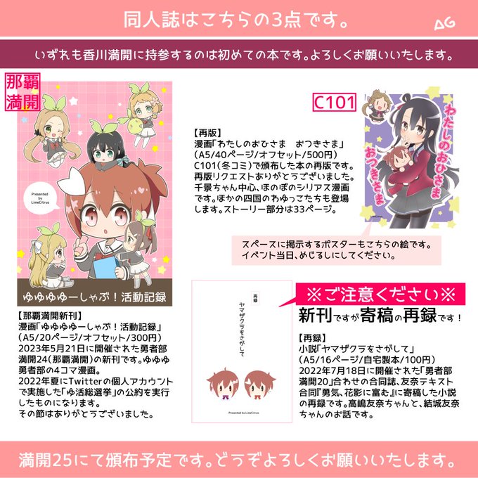 勇者部満開25における弊サークルの頒布物早見表です 詳細はスレッドをご覧ください どうぞよろしくお願いいたします🌸 お取り置きのご希望やキャンセルのご連絡は、リプかDMにて19日までにお知らせください ※ラバーモーテルキーホルダーはあまり数量がないため、お取り置きはご容赦ください twitter.com/aberebere/stat…
