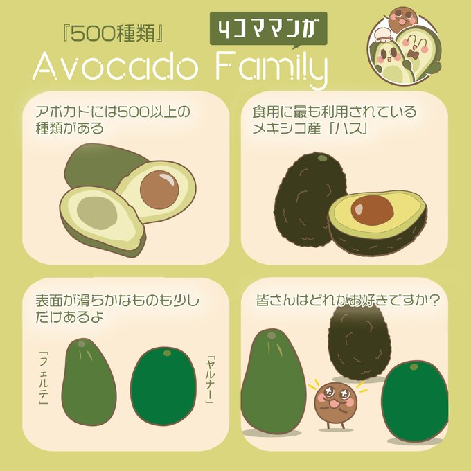 アボカド🥑の種類、 こんーなにあるんだって⁉️ 今日のアボカド豆知識です! #アボカドファミリー #アボ豆知識 #拡散希望RTお願いします #創作漫画 #4コママンガ #イラスト好きさんと繋がりたい