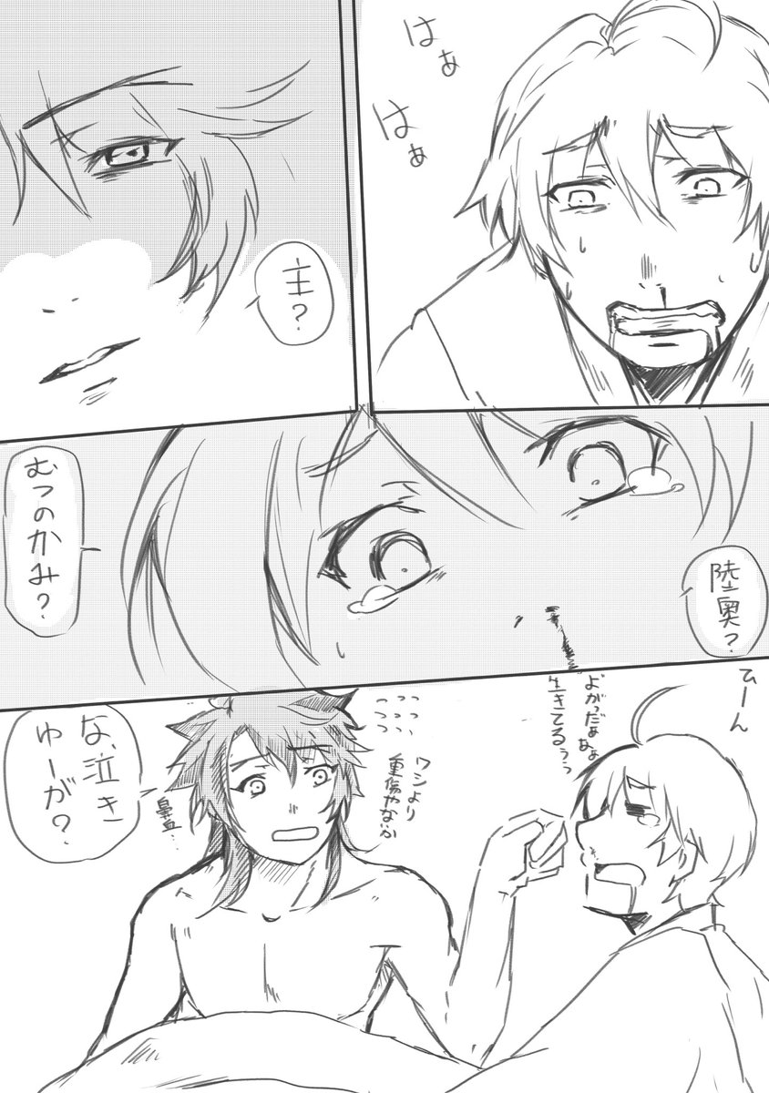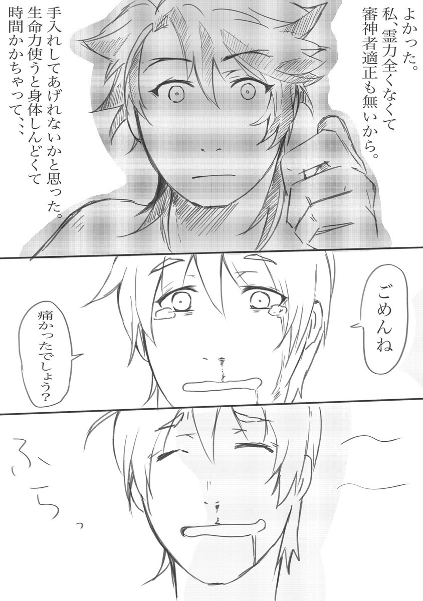 7 20 弊へしさに本丸のアルジちゃんと初期刀むつ。たぶんハッピーむつ。一番最初のチュートリアルで重傷になるの地味にトラウマってます。霊力皆無なので生命力削るから鼻血もゲ○も出ちゃうよねって。多分、鍛刀もゲロゲロしちゃう。むつはずっと支えてくれてるんじゃないかな(*´;ェ;`*)幸せにしたい。 22/10/19 00:54