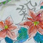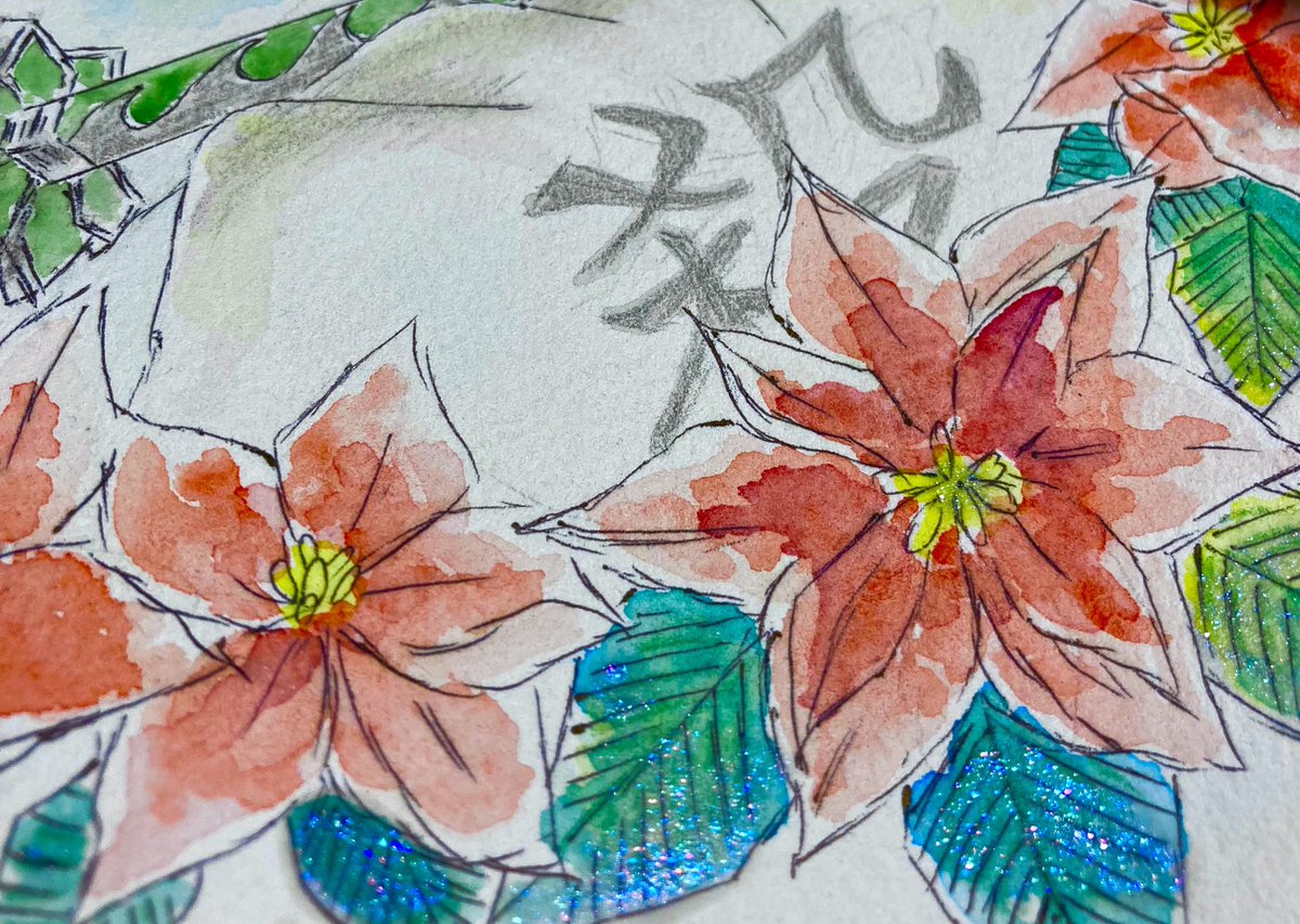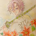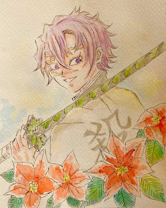#不死川実弥誕生祭2021 #不死川実弥生誕祭2021 兄ちゃんの笑顔🥰 お花はポインセチア、葉の部分は、未使用で眠っていたリップグロスを塗り塗り♪キラキラ感が伝わるように接写で撮影した写真も載せます〜! これ、なかなか乾かなくて💦ずっとベタベタしてる😂 透明水彩、水彩色鉛筆使用。