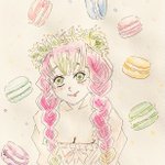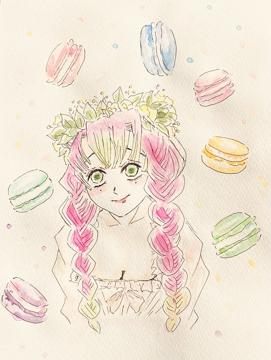 #甘露寺蜜璃生誕祭2022 #甘露寺蜜璃誕生祭2022 とにかく可愛い💕kmtキャラの中では、彼女を描くのが一番好きです🤤 マカロンで甘々な背景だったので、水彩の塗りはラフな感じにしてみました🤗
