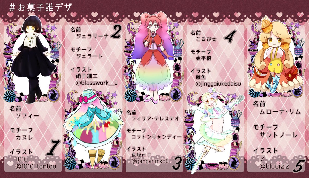 9 11 魚峰さん【@ ganganmko8 】主催の #お菓子誰デザ に参加させていただきました! 私が描かせていただいたのは10番のコレットちゃんです!! リプ欄にアンケート置くので私のデザインした子を当ててみてください! 21/03/26 17:47