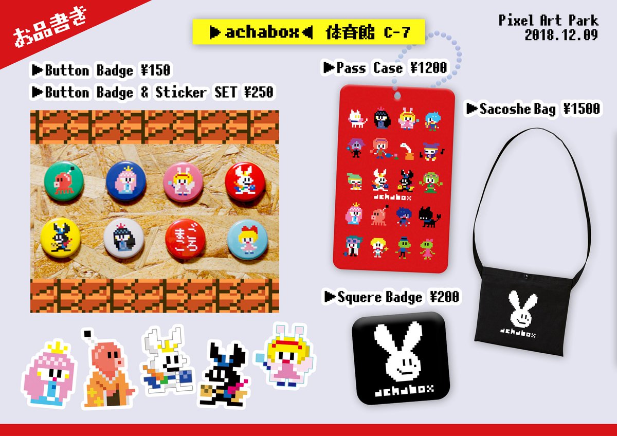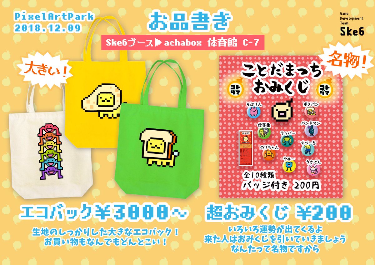 2 2 achabox 体育館 C-7 Ske6(@Kotodamatchi )もachaboxと合同ブースでゲームの展示とグッズも販売します〜!よろしくお願いします! #PixelArtPark 18/12/09 09:05