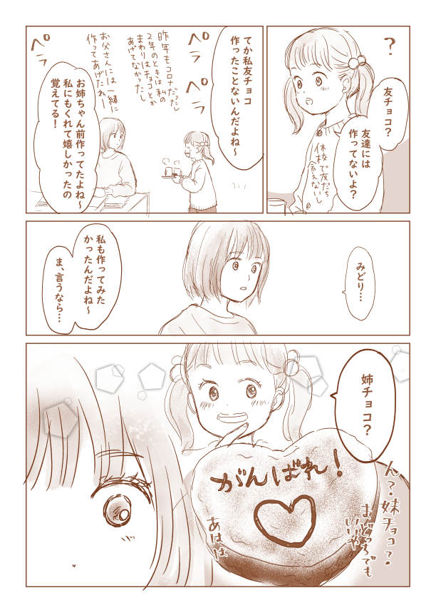 今日バレンタインか! 去年描いたバレンタインマンガです。 今年は姉妹のその後を描きたいと思ってたけど時間なく…無念… ハッピーバレンタイン!1/2 #バレンタイン #バレンタインイラスト #バレンタインマンガ #漫画が読めるハッシュタグ #マンガが読めるハッシュタグ