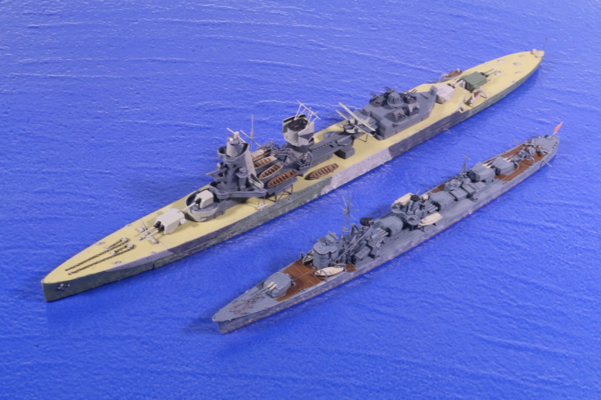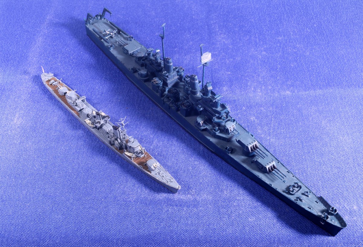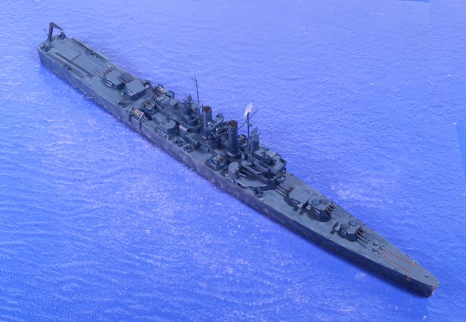 #今月作ったプラモ晒そうぜ #艦船模型 何とか今月に間に合った… あろは~! 米軽巡「ホノルル」1943、完成っす。 ヘレナ同様、PTのクリーブランド級からの改造です。 資料・写真が多い1944年より、図面が入手できて、一番戦いが多かった1943年時にしたんで案外手間が。 4枚目はヘレナと。