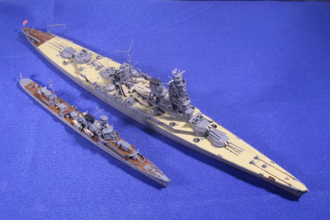 #今月作ったプラモ晒そうぜ ・ #八八艦隊 計画戦艦「近江」#八八艦隊物語 仕様 フジミ「巡洋戦艦赤城」を改造 ・軽巡「夕張」 ピットロード 今月はこの2隻じゃな。 それでも、これなら悪くない感じ。 それよりネ級改出場禁止令を