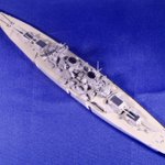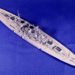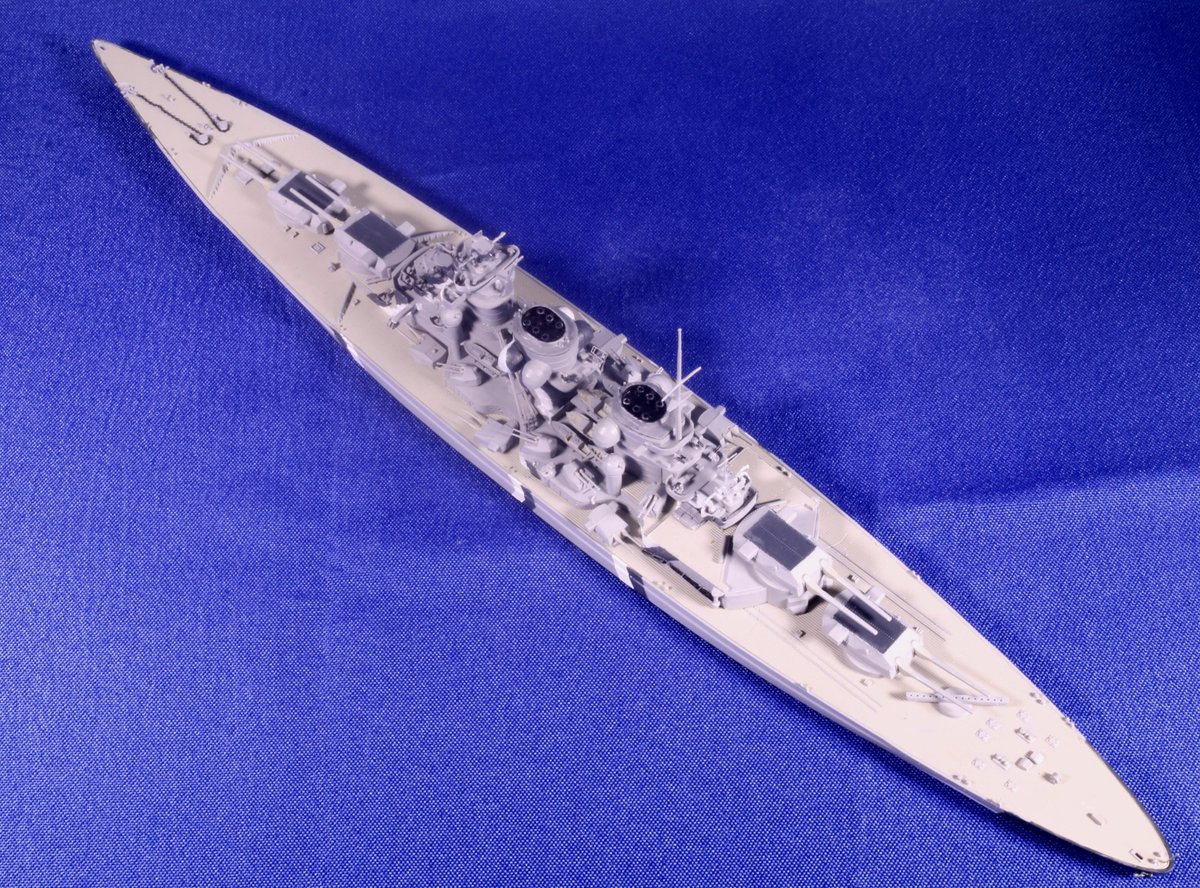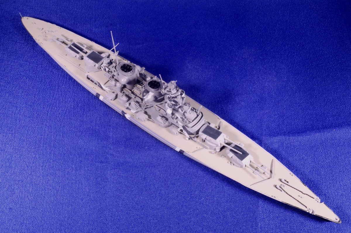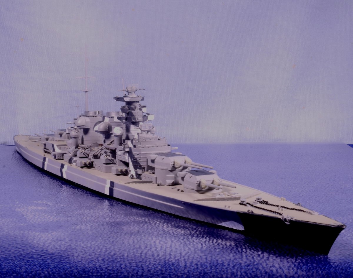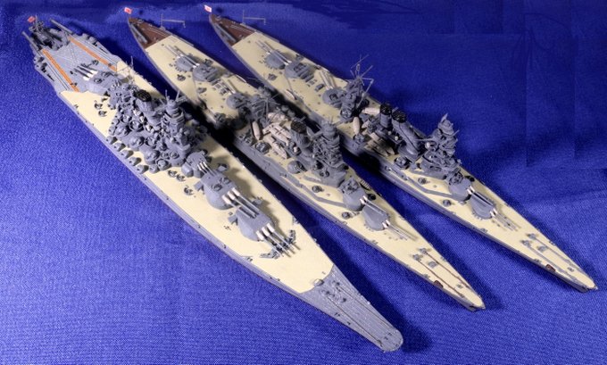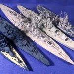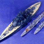 #今月作ったプラモ晒そうぜ ドイツの幻の超弩級戦艦「H級」1/700、完成。 ビスマルクの拡大型って聞いて、何やら大味になるのかなと思いきや、かっこいいデザインにまとまってる。作ってて驚きました。 艦名ですが、考えた揚げ句 「フリードリヒ・デア・グローセ」 に決定。 #艦船模型