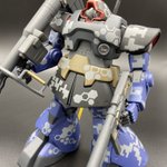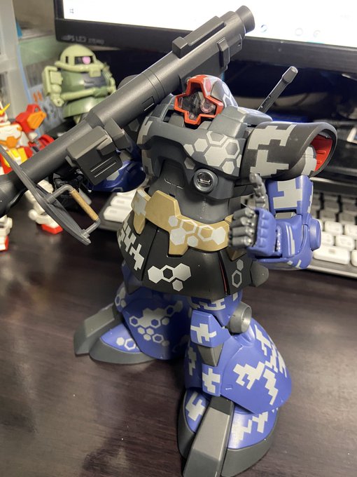MGドム完成しました、ドット迷彩とヘックス迷彩を合わせて胴体と手足の迷彩を左右逆にしたことでちょっとオシャレにしてみました! ドム君色々動くからポーズがつけやすいわw #ガンプラ #ガンプラ好きと繋がりたい #プラモデル好きと繋がりたい
