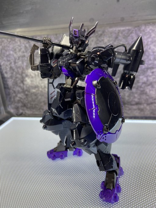ガンダムウヴァル完成! ガンダムフレームは焼鉄色で艶消し、外装パーツと武器はクリアブラックとクリアパープルのキャンディ塗装でエナメル赤で墨入れ。 ブラッドアイアン風にしたかったがなんか普通になっちゃったw #ガンプラ #ガンプラ好きと繋がりたい #ガンプラの画像を貼るとRTされると聞いて