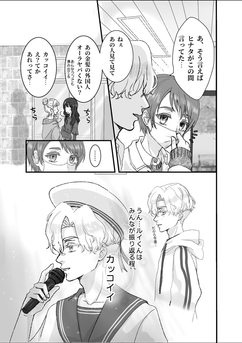 同じグループ内で両片思いになりつつあるルイ&ヒナタ ヒナタside 「ルイくんはとってもカッコよくて、こんな僕に付き合ってくれる優しい人です」 (3/8) #漫画が読めるハッシュタグ #創作BL