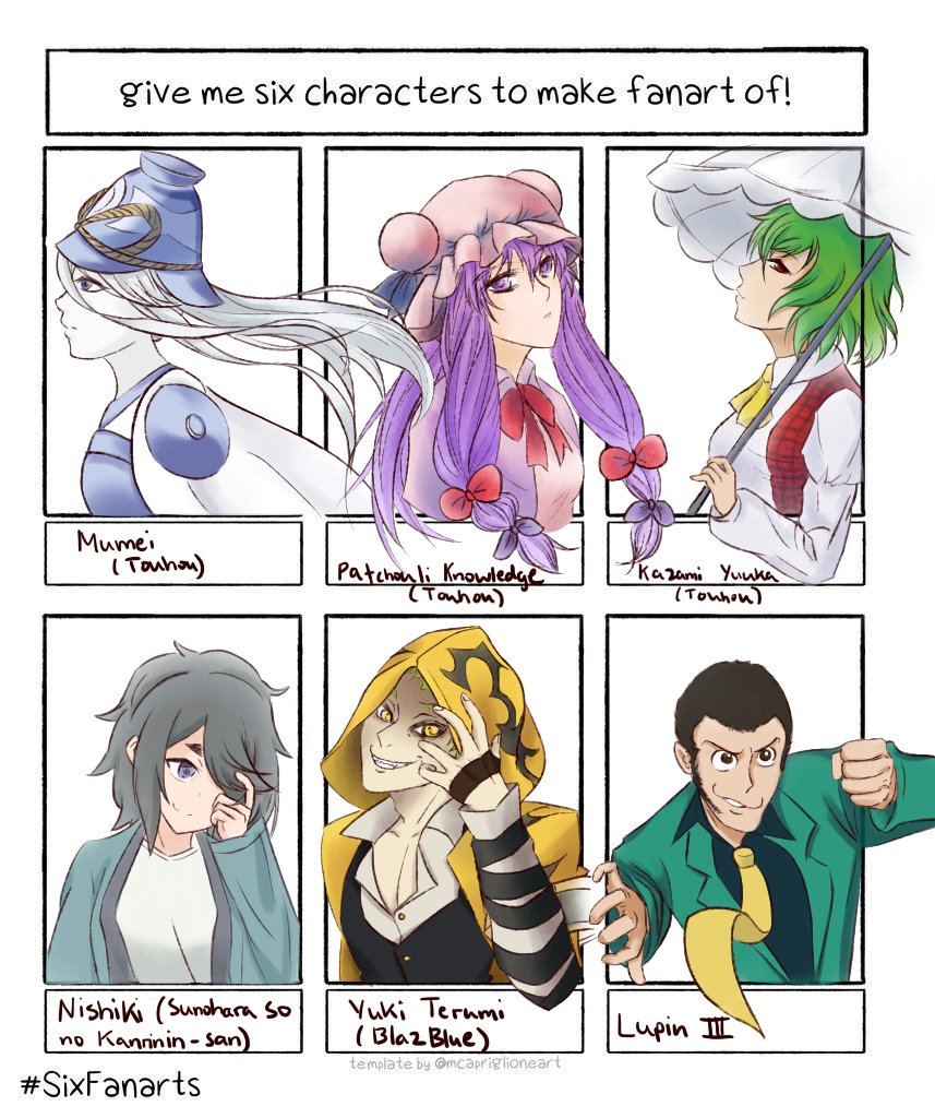 #SixFanarts #SixFanartsChallenge hope I'm not too late to this thing lol Thanks for the suggestions! My favorite ones to draw were patchouli, lupin III, and yuki terumi ^^ @a_cross_across @Private55469497 @GustavoMarcha19 @Jinx_LeStrange @Watamaka3 @moonlightoflife