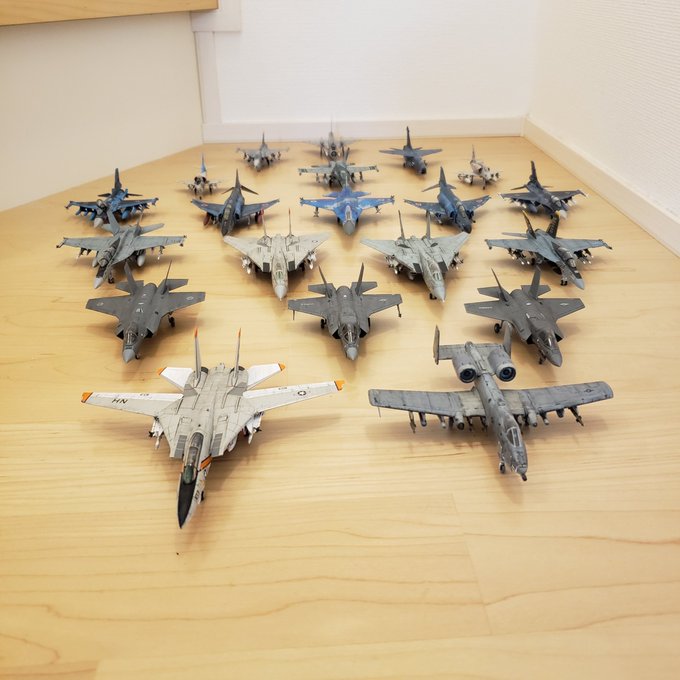 #今月作ったプラモ晒そうぜ エフトイズとレベルのF-142機です。 特に、マーベリック機カラーのF-14は460いいね以上頂くことが出来ました。ありがとうございます。 「やった者勝ち」みたいなネタ機体ですが、ガンプラのように設定まで考えたのは久しぶりです。楽しかった! 来月も作りますよ~