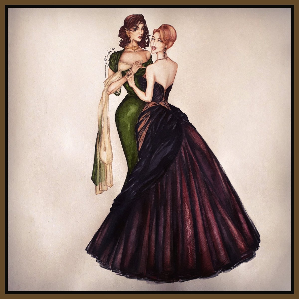 [The Prima Donna Minnie Park in conversation with an unknown woman, captured at a debut event circa 1960] #btsfanart #vminfanart #vminday #fashionillustration #Taehyung #Jiminie