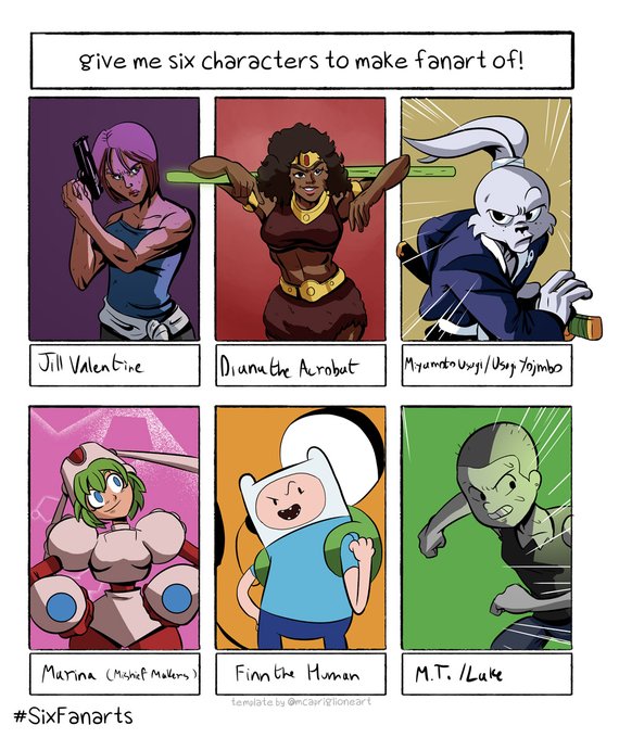 Here are my #SixFanarts. Thanks to everyone for the suggestions. #ResidentEvil3 #dungeonsanddragons #usagiyojimbo #tmnt #MischiefMakers #adventuretimefanart #infinitytrain #SixFanartsChallenge