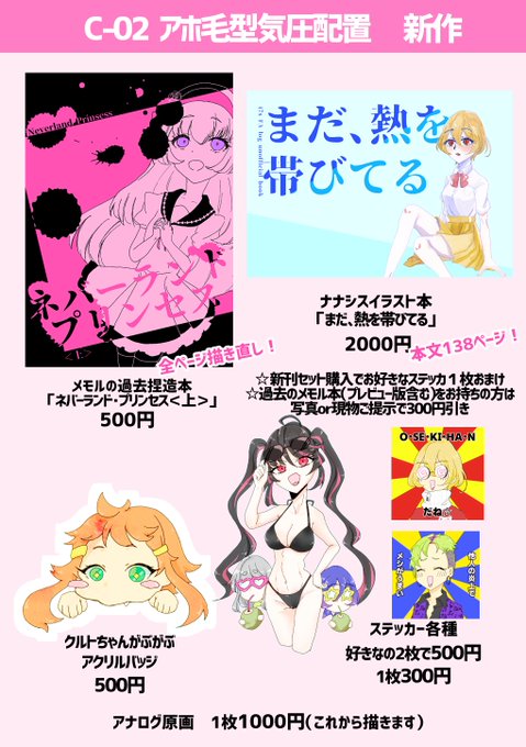 お品書きです!メモル本新装版とイラストまとめ本の2本立てにバッジとステッカーが新作になります。詳細や既刊はツリーに。 #ナナフェス
