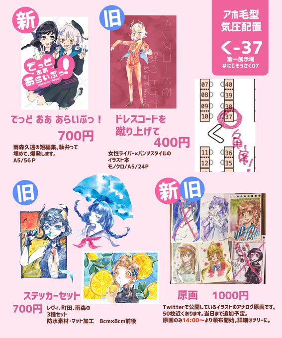 4 6 く-37 アホ毛型気圧配置のお品書きになります。原画のみ14:00~頒布になります。なにとぞ! #にじそうさく07 23/04/29 15:34