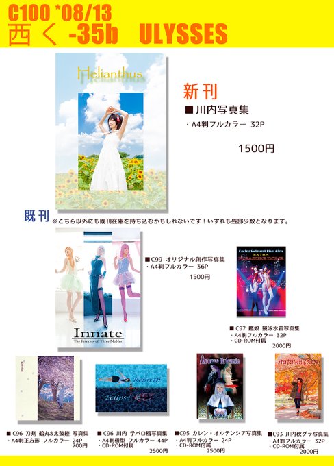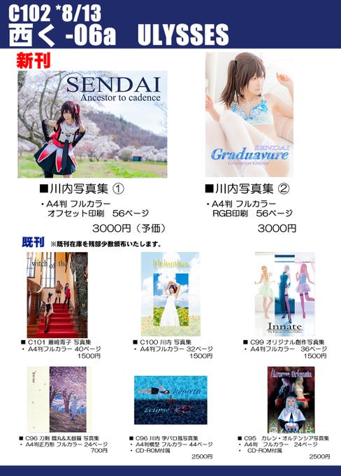 【C100 お品書き】 8月13日(土) 1日目 西「く」-35b 『ULYSSES』 新刊は川内写真集です! 当日新刊ご購入の方に2L判カード差し上げます🙌 既刊はこちら以外にも持ち込むかもしれません...! どうぞよろしくお願いいたします☺🙏 twitter.com/ageha_ulysses/…