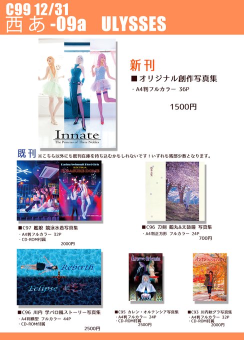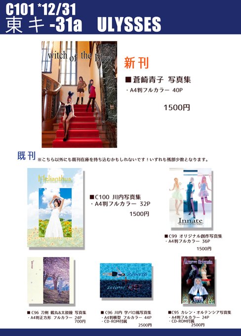 【C99 お品書き】 2日目(金)西「あ」- 09a 『ULYSSES』 新刊はオリジナル創作写真集です! 既刊は画像以外にも持ち込むかも...! 当日はどうぞよろしくお願いいたします☺🙌 ageha666.blog81.fc2.com/blog-entry-468…