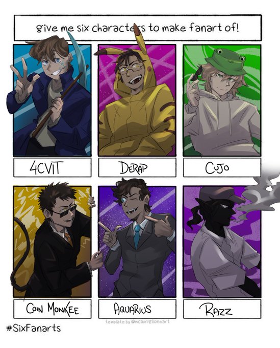 Its 5:19am, Sleep is for the week Im jumping on the #SixFanarts Hype train Goodnight internet! Featuring: @4_cvit @derapchu @CujoXD @coinmonkeee @Aquarius_User (I cant find Razz's twitter lmao) #mcyt #fanart #streamers #SixFanartsChallenge