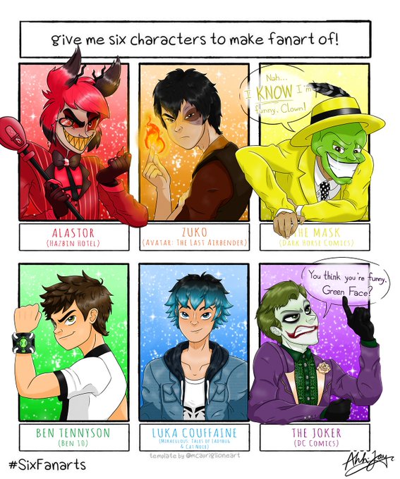 ♂️ SIX FANARTS - MALE ♂️ Here is my ALL MALE #SixFanarts. If you haven't seen the ALL FEMALE version, go check it out. #Alastor #HazbinHotel #Zuko #AvatarTheLastAirbender #TheMask #DarkHorseComics #Ben10 #LukaCouffaine #MiraculousLadybug #Joker #DCComics #fanart #digitalart