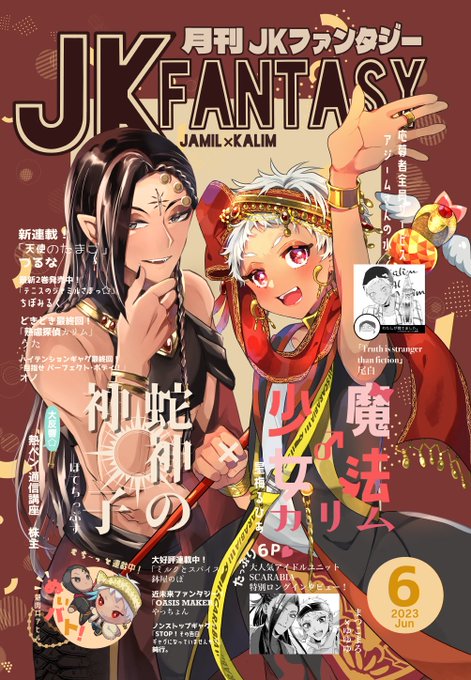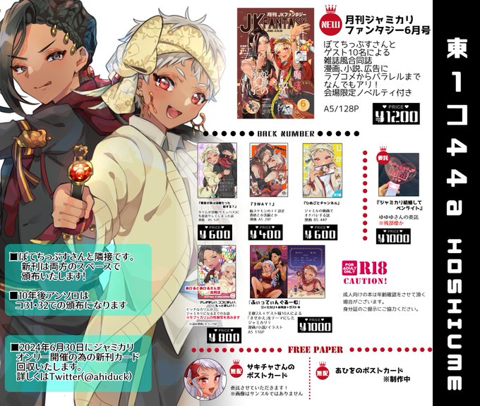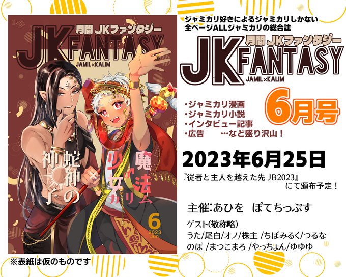 🐍6/25 JB2023 新刊☀️ 『月刊ジャミカリファンタジー 6月号』 主催あひを&ぽてちっぷす(@9TWs_Hearts)+ゲスト10名によるジャミカリ尽くしの雑誌風合同誌です。 全年齢/128p/A5/¥1200 【東1 コ44ab】にて頒布します! 🐯通販→ ecs.toranoana.jp/joshi/ec/item/… 🌸告知 pv →twitter.com/ahiduck/status