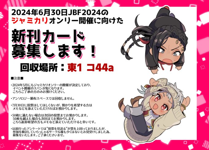 ⚠️おしらせ⚠️ 2024年6月30に向けてジャミカリのオンリー開催のための新刊カードを集めています! ご協力いただける方は弊スペース(東1コ44a)までよろしくお願いします! twitter.com/ahiduck/status…