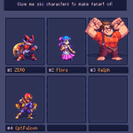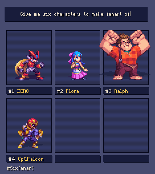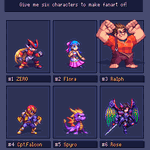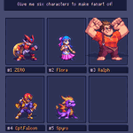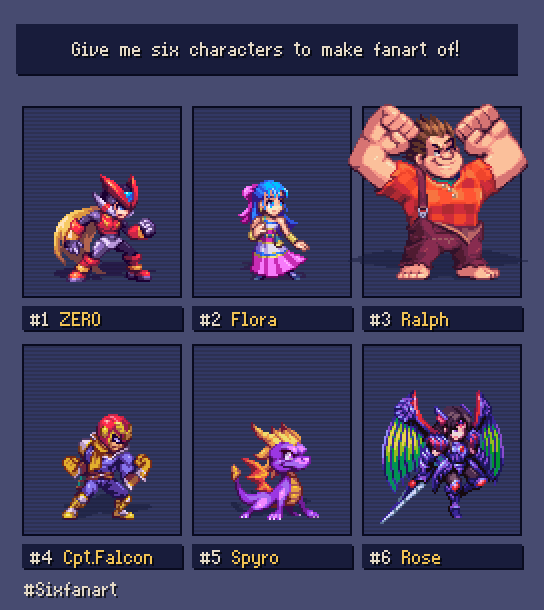 And #SixFanarts done!Thanks everyone for the wonderful suggestions, it was really hard to choose, may do more rounds in the future. #pixelart #sixfanart Zero @AndersonCrdoba7 Flora @LordMisfit Ralph @BearBoyJW Captain Falcon @Shoyoumomo_ Spyro @gtapper Rose @The_Zodi_Lady