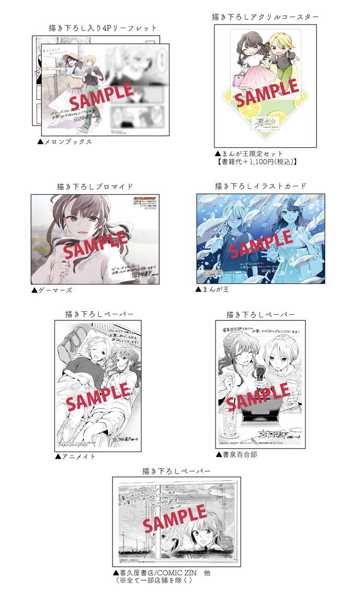 1月18日発売🍋 #夏とレモンとオーバーレイ の書店特典です! 全て描き下ろしました〜✍️まんが王さんのアクリルコースターは有償特典になります。 よろしくお願いします! #夏レモ #百合文芸