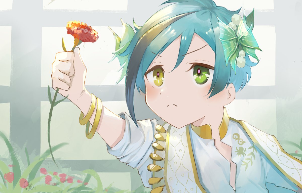 4枚目! クロスオーバーも描くよ! 二次創作作品が好きすぎて思わず描いて作者様に送ったものです。実はフラ初描き。逆光で描きたいけどあまり暗くしたくない、めっちゃ光ってほしいって思いながら描きました。 twitter.com/aidaamatou/sta…