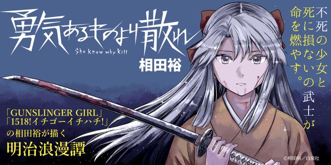 【1巻無料試し読み】#勇気あるものより散れ Renta!で8/17まで無料試し読み中です! 幕末明治を舞台に不死の一族と不死殺しの妖刀を巡る争いを描いた伝奇物語です。不死者とその眷属の組み合わせで様々なバディが登場しますのでそういうワードに惹かれたらぜひどうぞ!⇒ renta.papy.co.jp/renta/sc/frm/i…