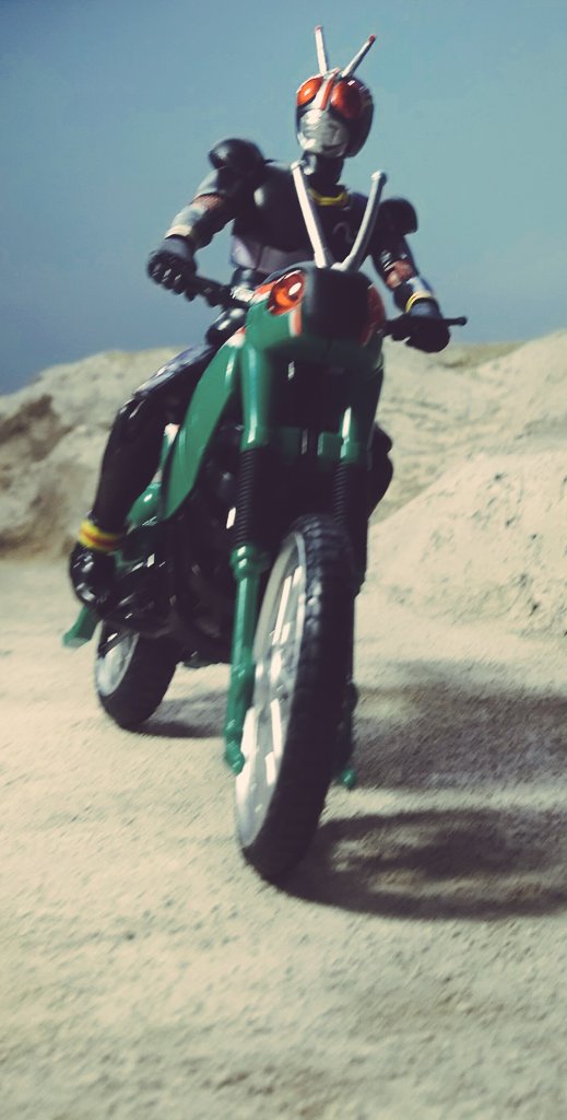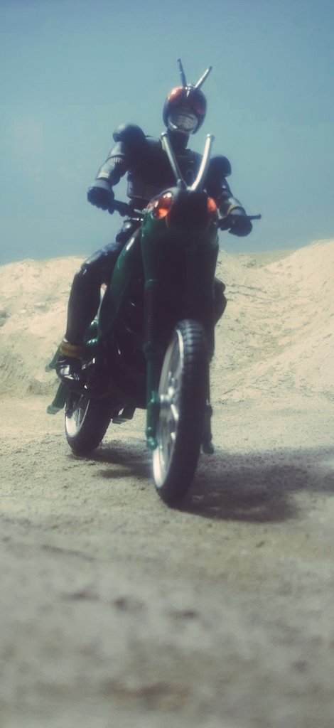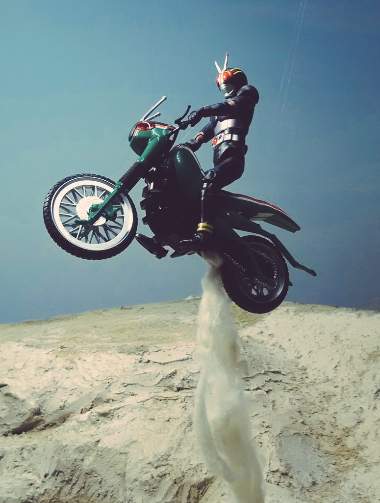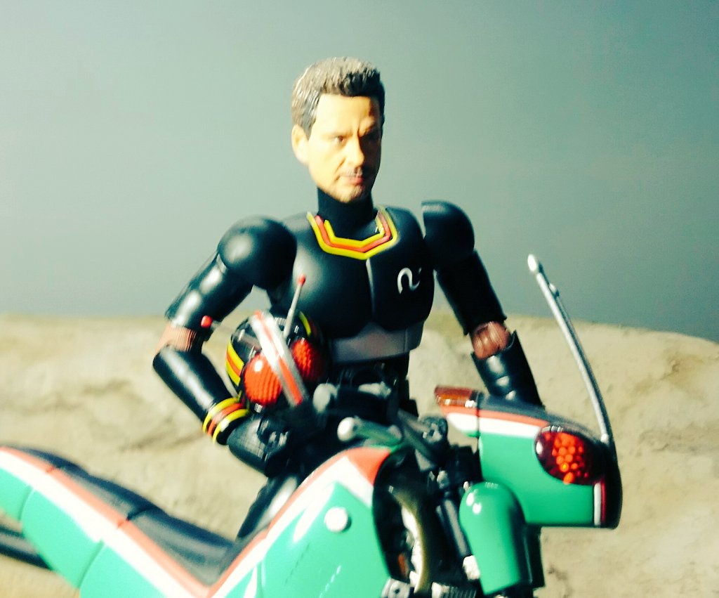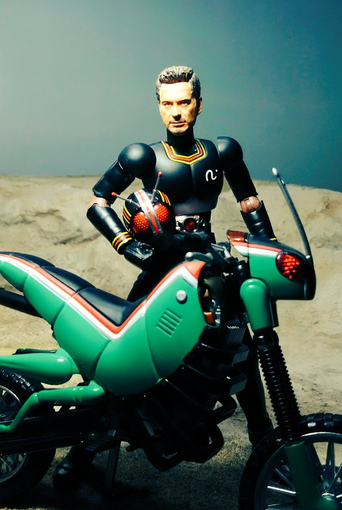 空想玩具レビューユーチューバートニー 「やぁ!こんばんわ!トニーの秘密基地にようこそ!」「今日も、コレクションを紹介するんだが…今回は、仮面ライダーBlackのコスプレをして、レプリカのバトルホッパーに乗るぞ!」 #空想玩具レビュー #アイアンマン #オモ写