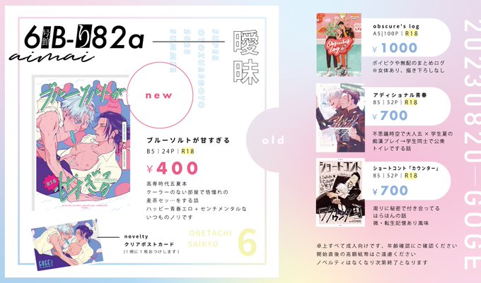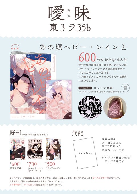 5/4 お品書き 東3ラ35b「曖昧」 五夏新刊、ノベルティ、無配でノズ田さん(@hirunebo_goge)との黒T五合同ペーパー、少しだけ家にあった既刊を持ち込みます。当日は宜しくお願いします! ☔サンプル:pixiv.net/artworks/10755… ☔通販:ec.toranoana.jp/joshi_r/ec/ite…