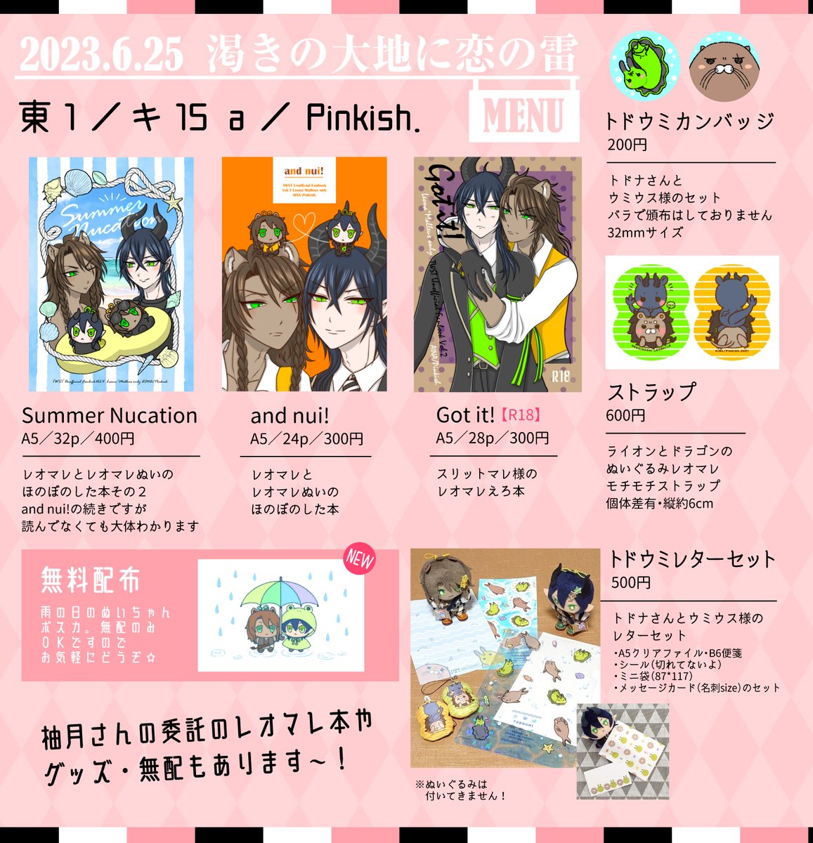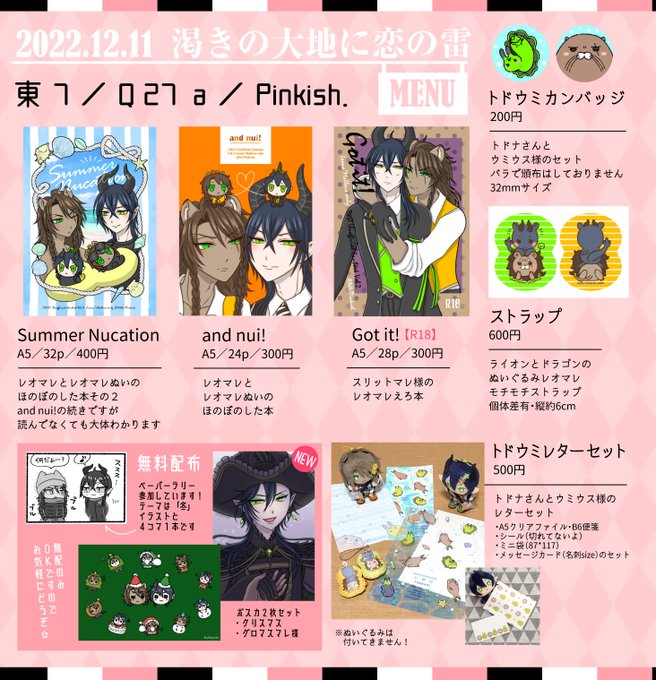 渇きの大地に恋の雷 DR2022 お品書きです🦁🐲 新しいものはないのですが、無配ポスカとペーパー貰いに来てください~! ※レオマレ ▼シブで見たい方はこちら pixiv.net/artworks/10334… #1211レオマレ #かわこい20221211