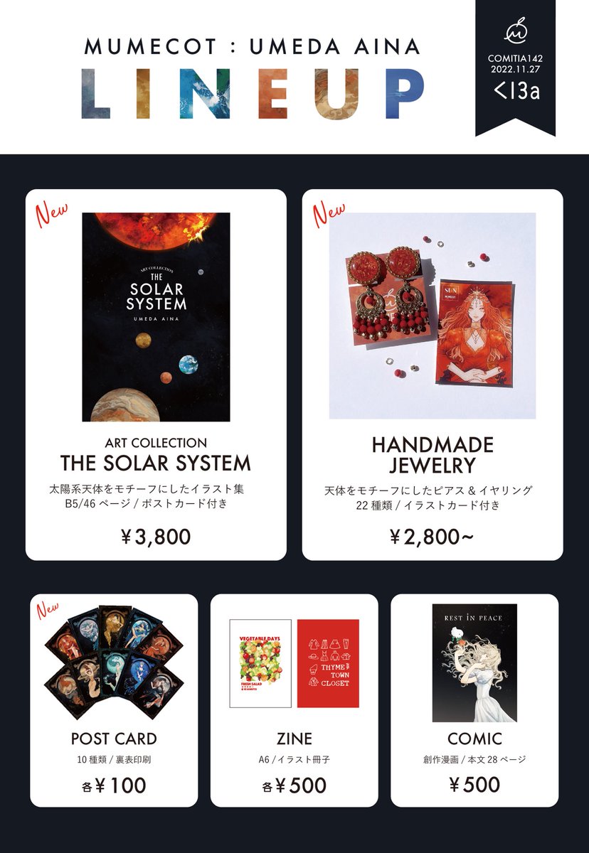 【COMITIA142お品書き】 天体本の他に過去作のZINEと創作漫画も持って行きます!ポストカードは釣り銭の関係で通販より安くなっております。 #COMITIA142 #コミティア142