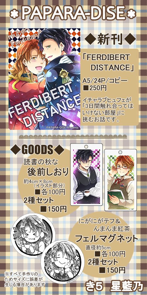 5/4プチオンリー【東2 ウ51a】のおしながきです!すべてヒュフェです。 後前新刊、既刊、3月こくほこで無配した前前漫画を持っていきます。ペーパーもありますので、お気軽にお立ち寄りくださると幸いです~! 新刊サンプル→pixiv.net/artworks/98026… 宜しくお願い致します! #鴛鴦のダイアログ
