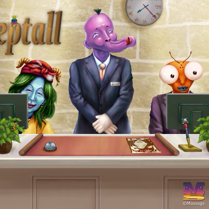『Welcome to the 【Hotel Acceptall】』 妖怪が運営する宿泊施設「アクセプタル ホテル」のフロント。 人間が宿泊すると妖怪界に迷い込み、二度と元居た世界に帰れないと噂があるが、 社長(イラスト左)曰く、「事実無根!風評被害です。」とのこと。 #新作イラスト #絵描きさんと繋がりたい