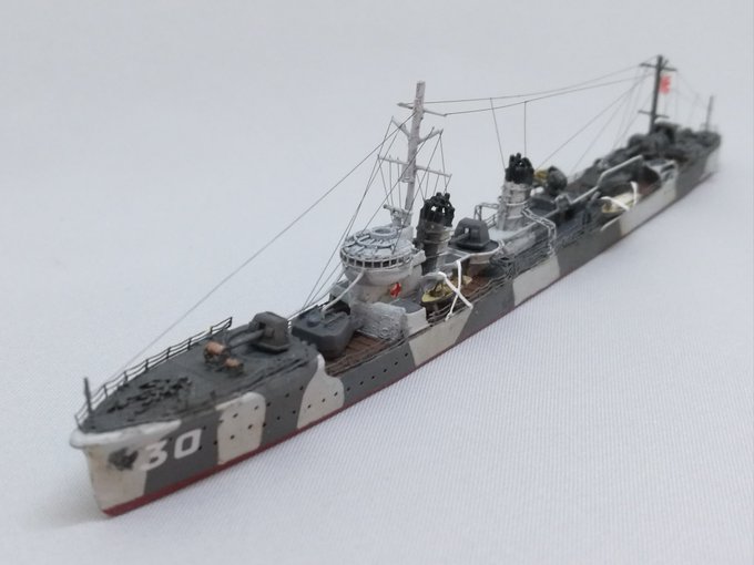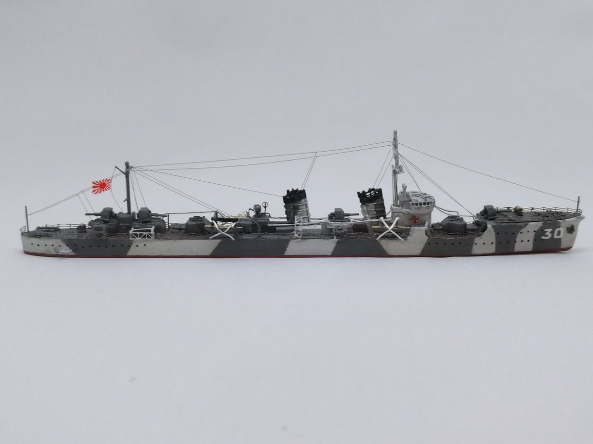 17 95 ハセガワの睦月ですが張り線をしました。機銃は後からつけますが、これで完成です。#ハセガワ #艦船模型 #睦月 #ウォーターライン 19/04/20 15:14