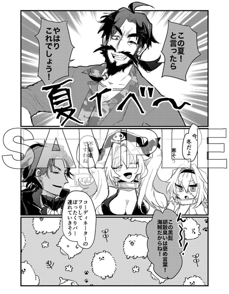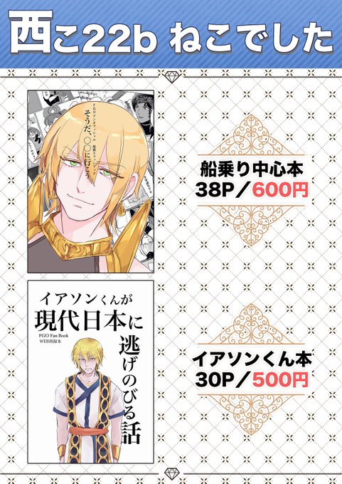 C99新刊「そうだ、○○に行こう」 | エア子 #pixiv pixiv.net/artworks/95090… 船乗ってる英霊(ガバ判定)のオムニバスです。 いつもの森野と合同ハートフルストーリー。 P38 600円 30日木曜日西こ22b「ねこでした」 明日ぐらいにお品書きあげます。 よろしくお願いします。 #C99新刊