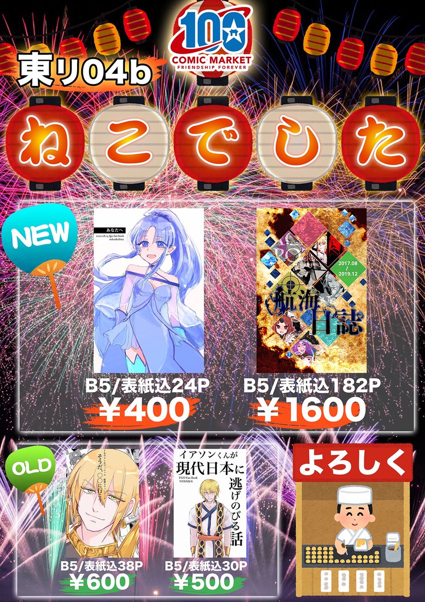 あなたのサークル「ねこでした」は、コミックマーケット100で「日曜日東地区 "リ " 04b」に配置されました! webcatalog.circle.ms/Circle/1621704… #C100WebCatalog いつもの船乗りサーヴァントの本を出します。今回は聖杯メンバーも描きたい。大体みんな船乗ってる⛴
