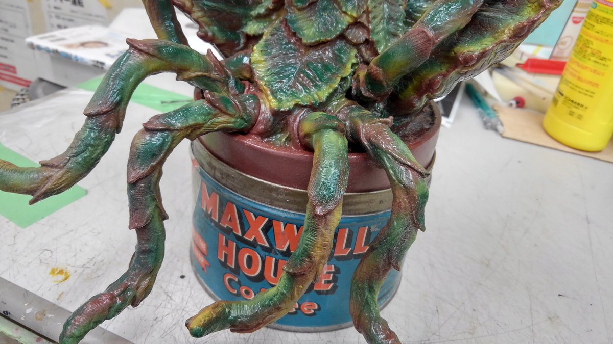 マーミット製の非常にキュートなグリーンのワルが届きました! ここは是非マックスウェルコーヒーの缶に入れて、よりシーモア気分に浸りたいところですが微妙に入らないのでソフビの鉢を切って入れるか悩み中...。