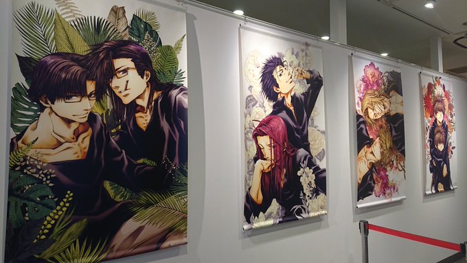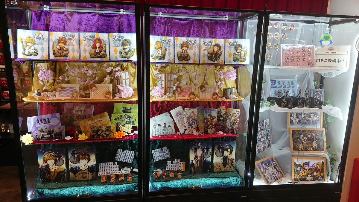 97 211 最遊記カフェ、池袋店内レポ① まず入ってすぐに、現世・前世組のタペストリーがお出迎え。反対側はグッズ・特典・プライズが並んだショーケース。 20/02/29 12:19