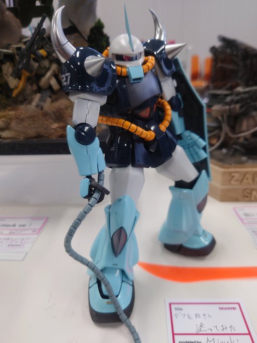 おかホビ2021が開催中! 私の作品を展示して貰いました! 銀基調のザクで、頭が赤いのが1.0、頭が黒いのが2.0です。 ムサイの誘導役貰えるとは、感激です!! #おかホビ2021 #ガンプラはどんな自由な発想で作ってもいいんだ #ガンプラの画像貼るとRTされると聞いて #ガンプラ好きと繋がりたい