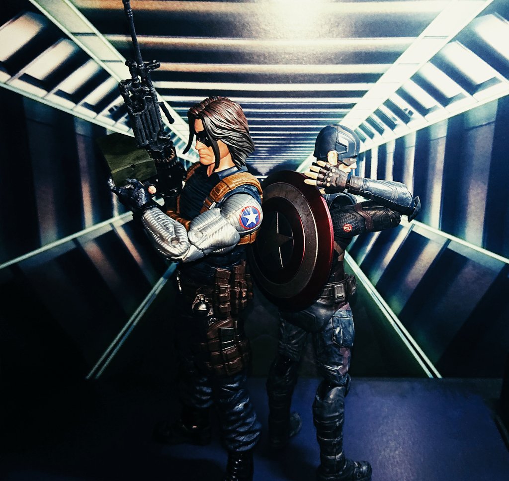 #おもちゃ撮影会 お題「ペア」 背中を預けられるおじいちゃん達 今日届きたてホヤホヤのウィンターソルジャーと並べると、やっぱフィギュアーツよりコミック版のハズブロキャップも用意したくなってくるなぁ(:3[_____] #オモ写 #ウィンターソルジャー #キャプテンアメリカ