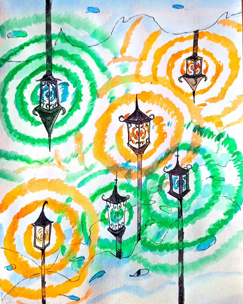 #Botober, day 24, mist lamps glow with circling green and orange and green and orange and green and orange and green and orange and green and orange and green and orange and green and orange and green and orange and gree #botober2021 #inktober #inktober2021 #traditionalart #ink