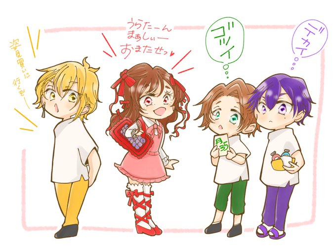 Plusss 🚢💚💜❤️💛 💚 ここちゃん 💜 蒼くん ❤️ よんちゃん 💛 あじこ ※メンションはリプにいたします。 #うらたぬ王国の美術館 #しまーと #坂田です #センラの絵ぇやん