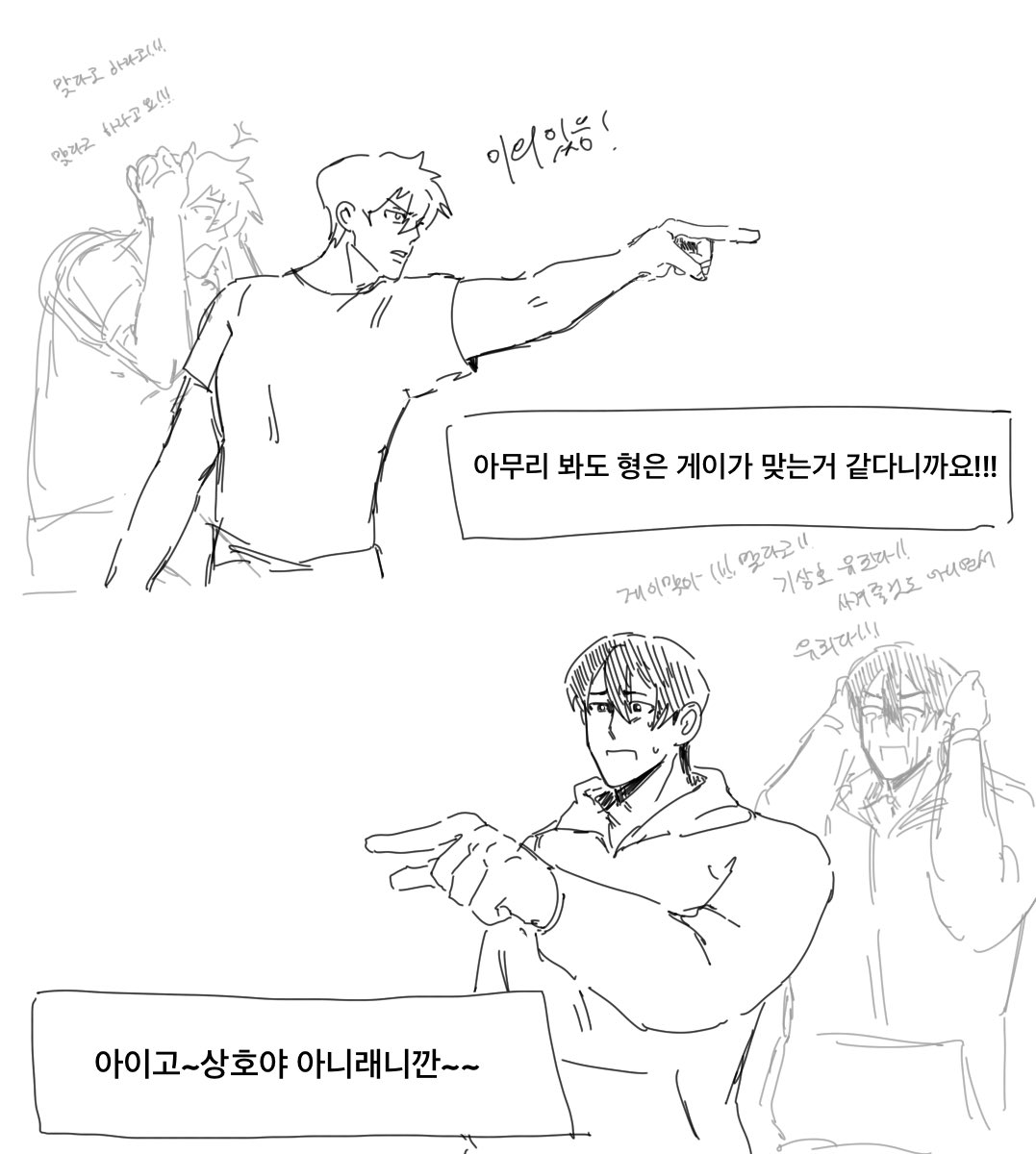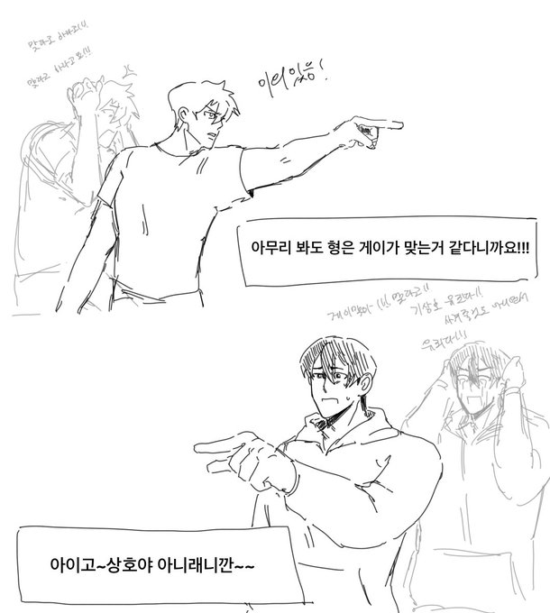 여하튼 그렇게 둘이.. 진짜 성인이 되고 나서도 둘의 이 헛짓거리는계속됨. 이 일은 모두 박병찬이 기상호가 자신을 좋아하는 줄 몰라서 벌어진 일이고, 여전히 박병찬은 그걸 모르고 있기 때문에 계속 니 게이 아이가!!1 하는 상호가 야속하기만 함. 박병찬 안의 상호는
