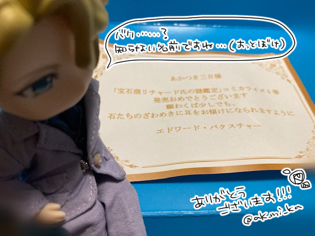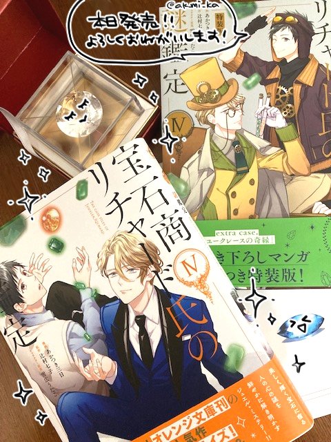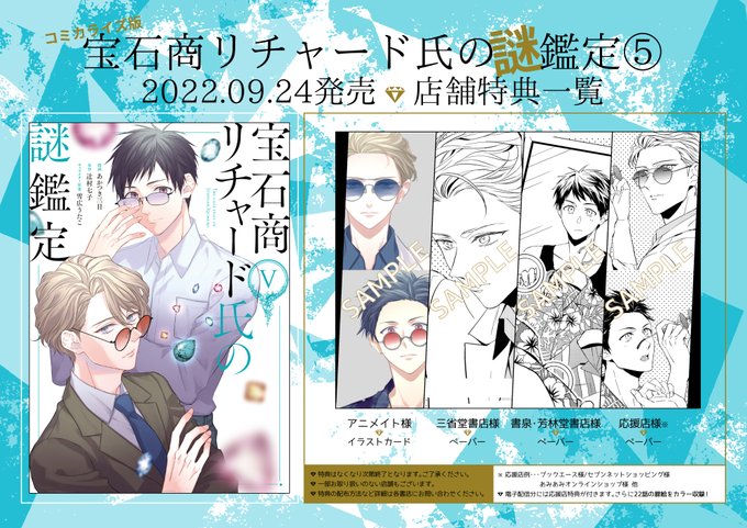 【発売まであと…😎😎😎😎】 4日となりました。 【9/24(土)発売】『宝石商リチャード氏の謎鑑定』コミカライズ版単行本⑤巻 店舗特典全4種 中身も特典もたくさんこだわりを詰め込みました。 お見かけになりましたらぜひ、よろしくお願いいたします。 #宝石商コミカライズ