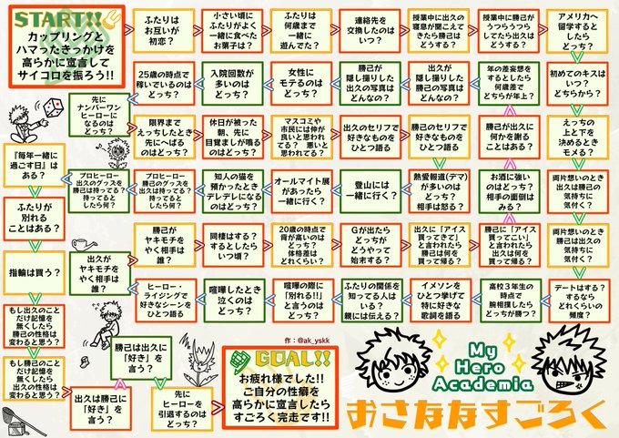 64 209 無意識に消した?消えた?みたいなので再掲します……いいねして下さった方々スミマセン!! MHAの幼なじみを語るすごろくです。勝デクでも出勝でもリバでも遊べるようになってます!! ご自由にお使い頂けたら幸いです!! 20/06/11 00:37