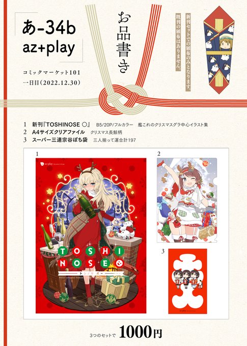メロンちゃんの作品ページできてた!というわけでC101新刊『TOSHINOSE ○(トシノセ オー)』 ゲームに実装されてたりされてなかったりするクリスマスグラ中心のフルカラーイラスト全年齢ウスイブックです。会場では長鯨のクリアファイル・宗谷ぽち袋とのセットになります!melonbooks.co.jp/detail/detail.…