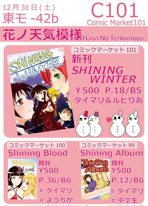 いつも通りのダイマリですわ~💎✨ 時間があったら別のカップリングも描きたいですね(CEO) あなたのサークル「花ノ天気模様」は、コミックマーケット101で「土曜日東地区 "モ "42b」に配置されました! webcatalog.circle.ms/Circle/Map/168… #C101WebCatalog #C101